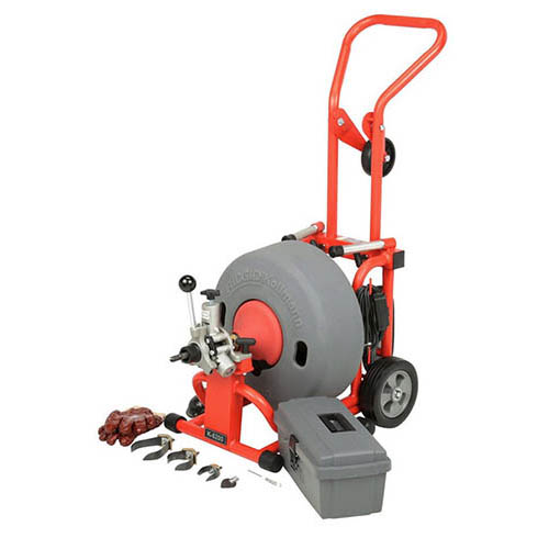 The RIDGID K-6200 w/C-24 (95732) Auto-Feed Drum Machine for 3 in. to 6 in. Drain and Sewer Lines, with C-24 5/8 in. x 100 ft. Inner Core Cable and Tool Set (115V) will clean drain lines from 3 in. to 6 in. in diameter and up to 200 feet in length. The 4/10 HP universal motor spins 5/8 in. cable at 285 RPM. When the cable hits the blockage, the motor gears down automatically to deliver greater power and enhance operator control.